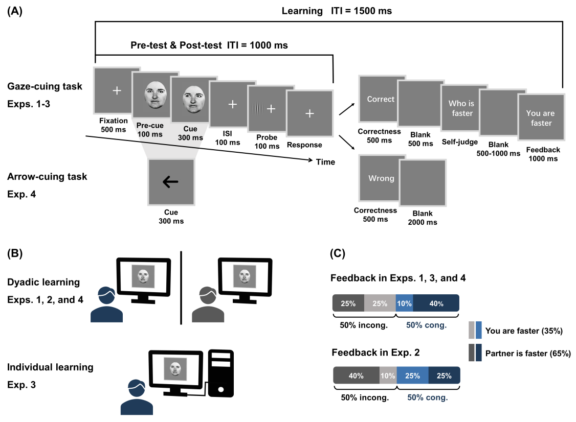 中国科研院心理研究所蒋毅研究组的科研人员召开了一项研究(图1),发现与在社会线索利用方面更加熟练的同伴进行双人学习能提高被试的社会性注意能力。研究采用双人学习范式来构建社会情境,两名被试同时完成注视线索提示任务,并顺利获得即时反馈得知谁在本轮按键中做出了更快的反应。这看似真实的互动背后隐藏着精心设计的“剧本”:被试并不知道他们收到的反馈是预先设定好的(图1C)。