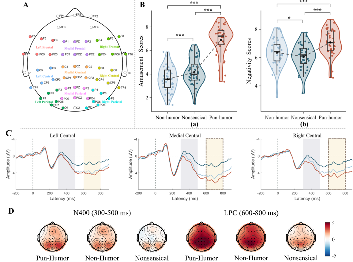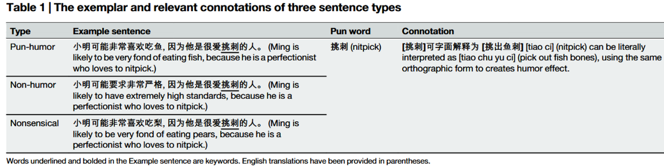 研究团队设计了三类包含相同负面关键词的中文句子:双关幽默句(Pun-humor, 如“小明可能非常喜欢吃鱼,因为他是个爱挑刺的人”)、非幽默句(Non-humor)和语义无关句(Nonsensical)(见表1)。顺利获得行为评分与脑电记录,系统考察被试在实时理解语言时的情绪体验。
